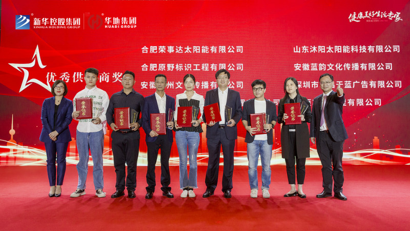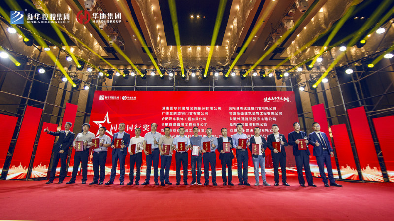 最后新華控股集團(tuán)副總裁兼華地集團(tuán)執(zhí)行總裁吳守狀先生、 新華控股集團(tuán)副總裁兼華地中安總經(jīng)理黃傳偉先生共同為標(biāo)力建設(shè)集團(tuán)有限公司、安徽省隆峰建設(shè)工程有限公司、浙江中成建工集團(tuán)有限公司、天元建設(shè)集團(tuán)有限公司、安徽省第一建筑工程有限公司頒發(fā)“年度卓越合作大獎”,將本次盛典氣氛推向高潮。