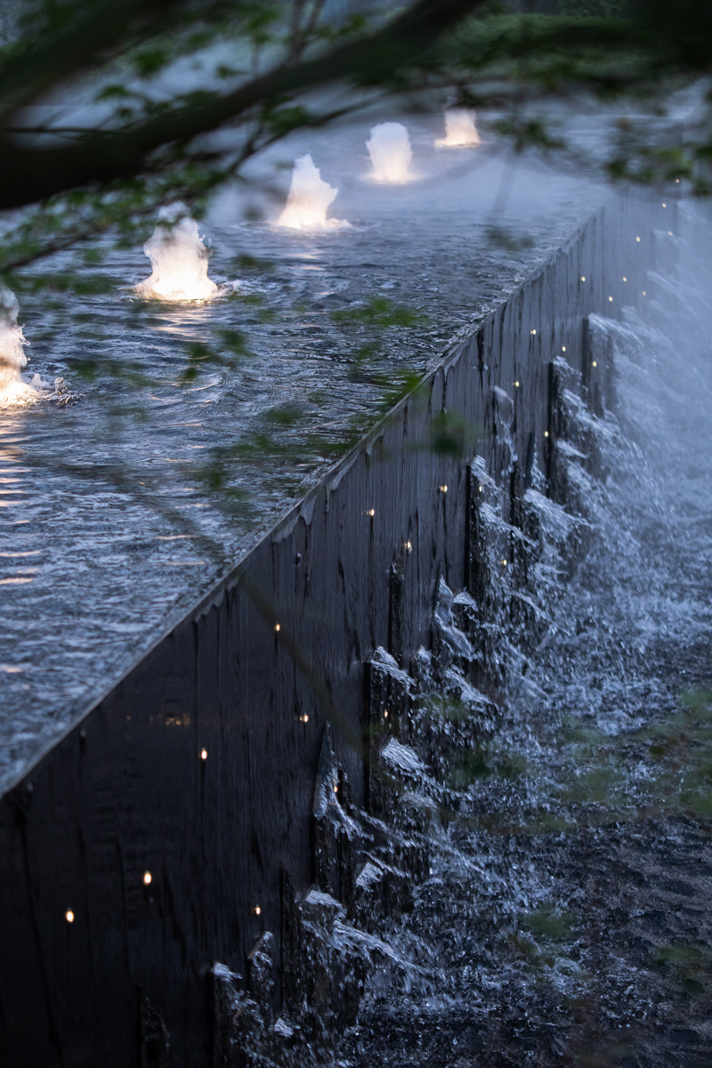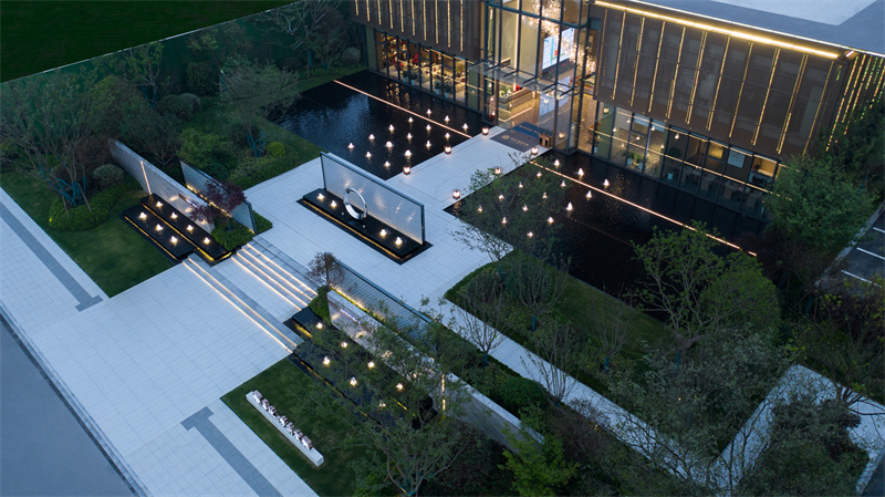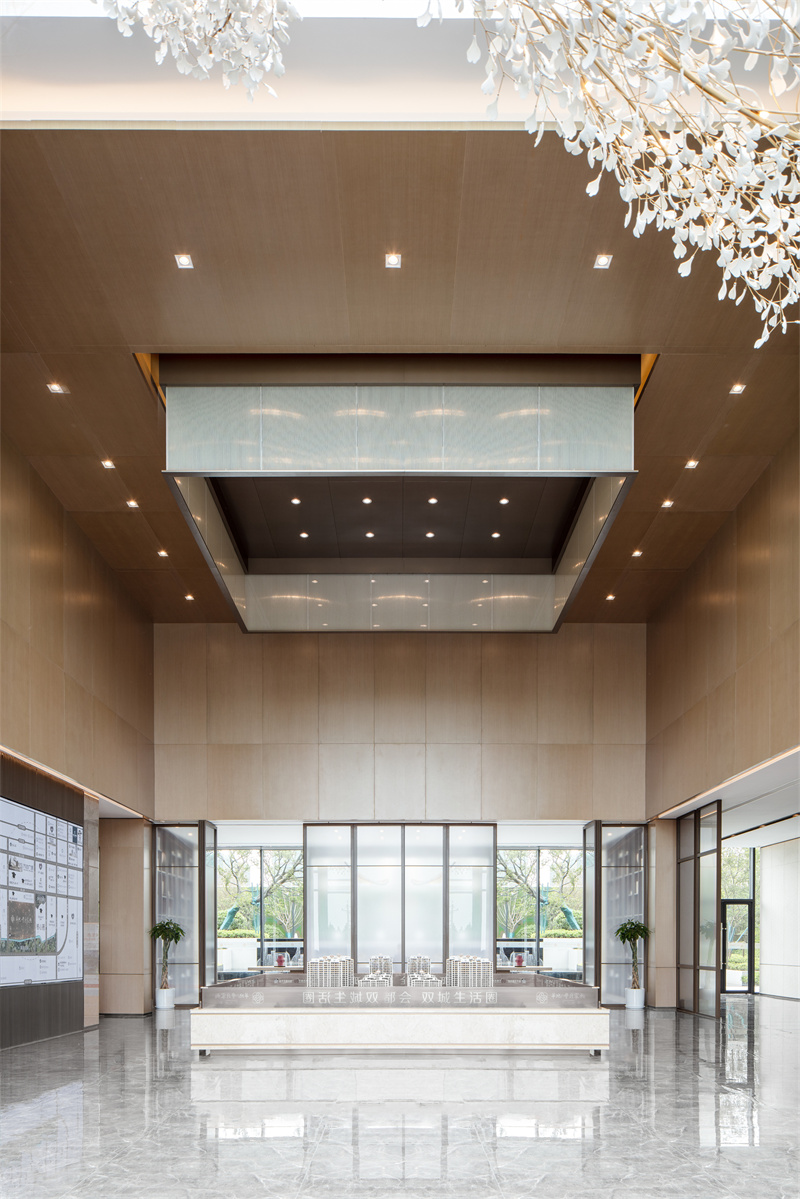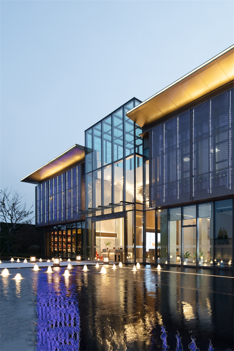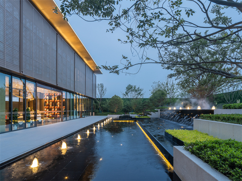 為致敬當?shù)匚幕厣运鰹榄h(huán)境的靈魂,一進迎賓,二進觀湖,三進尋瀑,將水揮灑到極致,在整個空間場景中呈現(xiàn)一場靈動的詩意美學。流水潺潺淙淙,仿佛輕奏歌謠,迎接每一位來賓的到訪,人與生活的嶄新通道,也借由這片水景,緩緩打開。