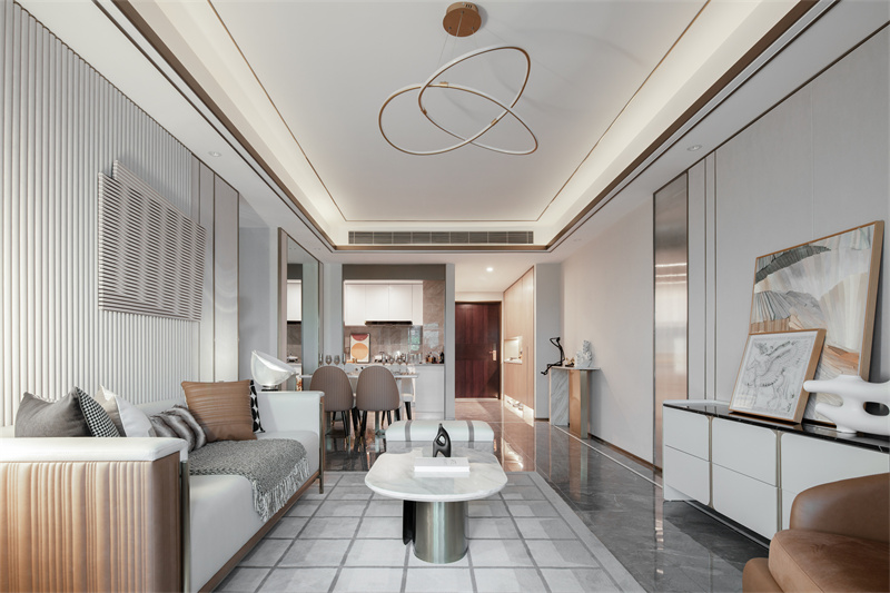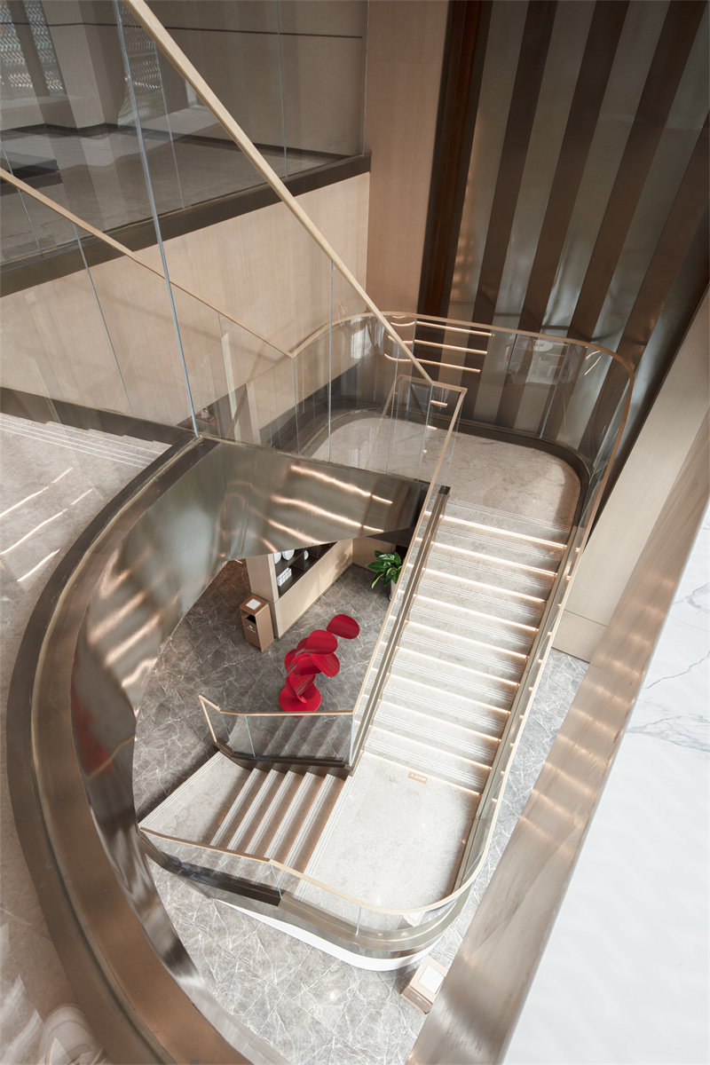 不遠處的藝術(shù)樓梯,讓另一側(cè)的景觀不再單調(diào)。玻璃、金屬扶手,高級冷艷,白色大理石踏步、金屬包邊,陽光與燈光交相輝映,在樓梯上描摹出水的波紋,讓通往二層的樣板區(qū)空間更具儀式感。