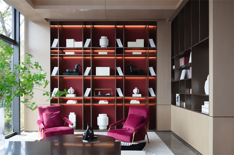 在帶有更強私密性的深度洽談區(qū),設(shè)計師通過兩側(cè)柜體構(gòu)筑起一片自成畫意的空間。大面的景觀視野、金屬線條的置物架,整個空間通透明朗,紅色的背景、座椅點綴其間,氤氳出空間的靈動、時尚的氣質(zhì)。