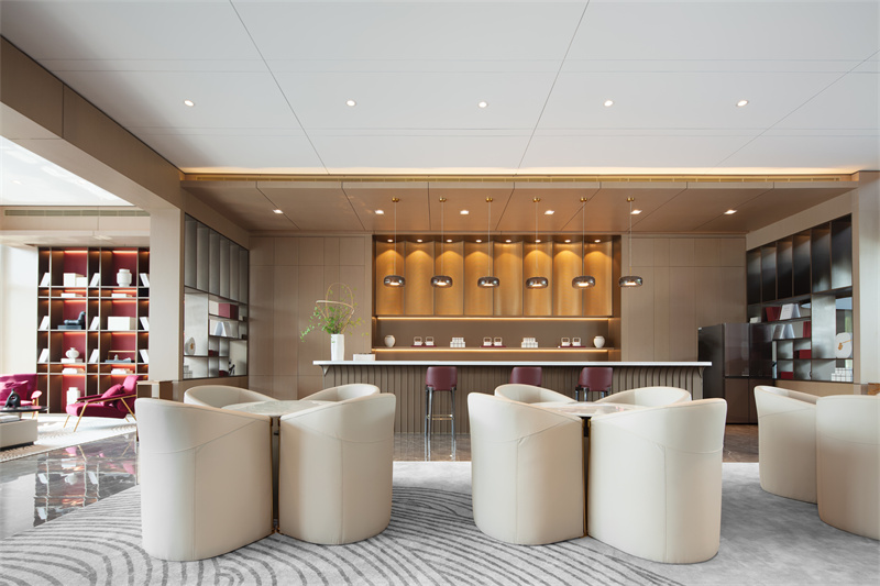 藝術(shù)和自然總能在某個節(jié)點美妙結(jié)合。陽光透過玻璃帷幕躍進室內(nèi),將花型裝置渲染得明亮生動。溫潤內(nèi)斂的淺色系大理石,在燈光的映襯下,與銅色金屬碰撞出輕奢質(zhì)感。洽談區(qū)延續(xù)了雅致、輕奢的質(zhì)感,用金屬、木質(zhì)、大理石、玻璃、皮、布藝等材質(zhì)打造空間的豐富體驗,利用材質(zhì)的軟與硬、剛與柔對比出空間的層次感。
