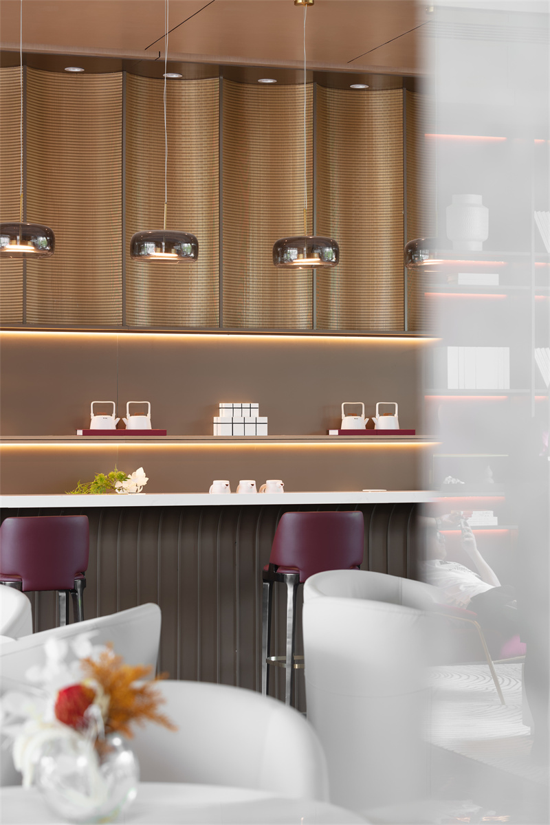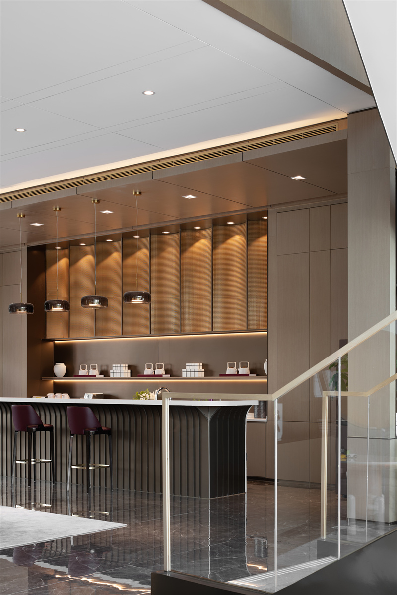 空間運用大面積木色墻面與灰色系瓷磚、局部以沉穩(wěn)的褐色與柔媚的紅色調(diào)和,傳遞出現(xiàn)代、優(yōu)雅、奢貴的氣質(zhì)。水吧金屬波紋背景墻和玻璃吊燈,把水之美展現(xiàn)地淋漓盡致,創(chuàng)造多層次的感官體驗。