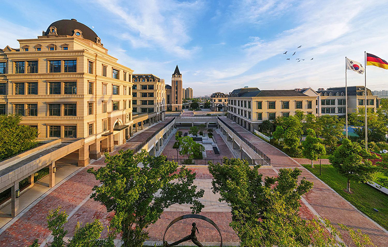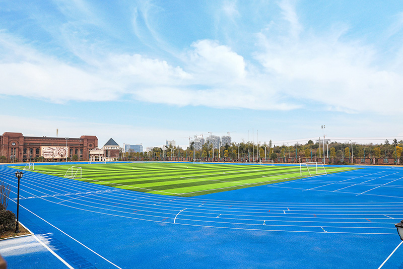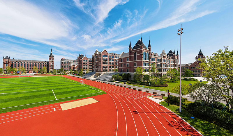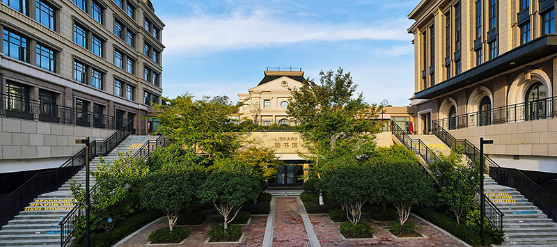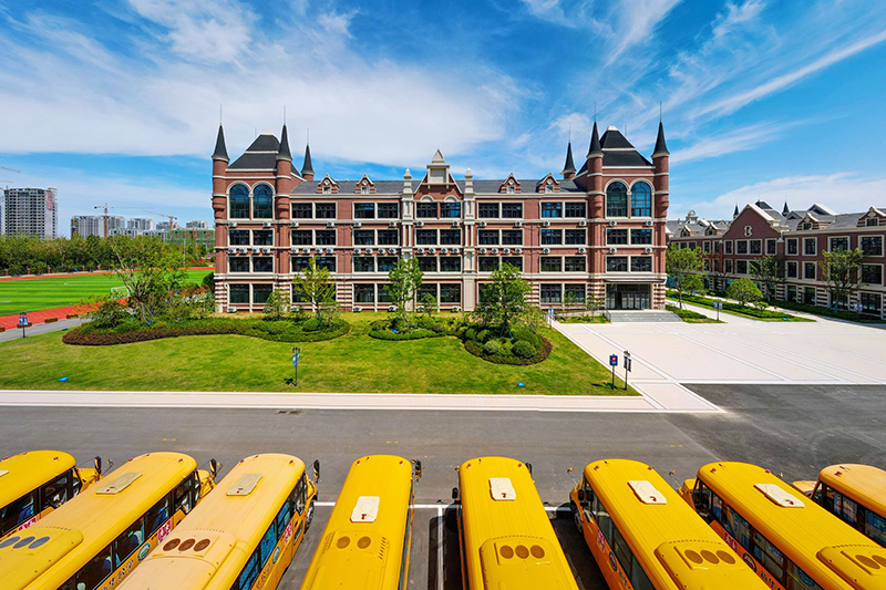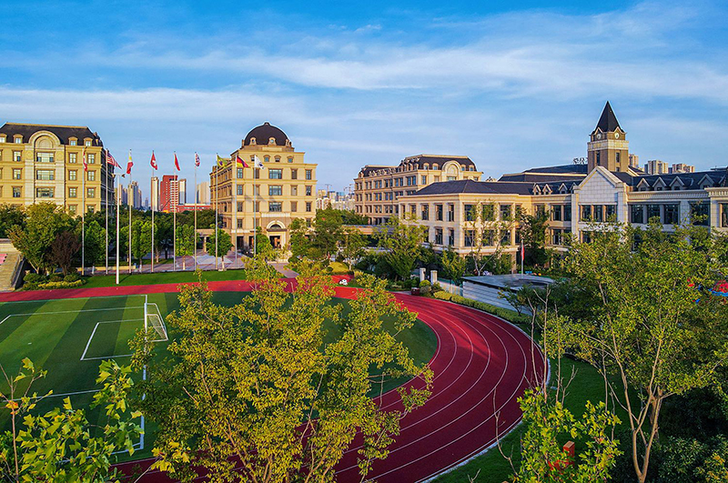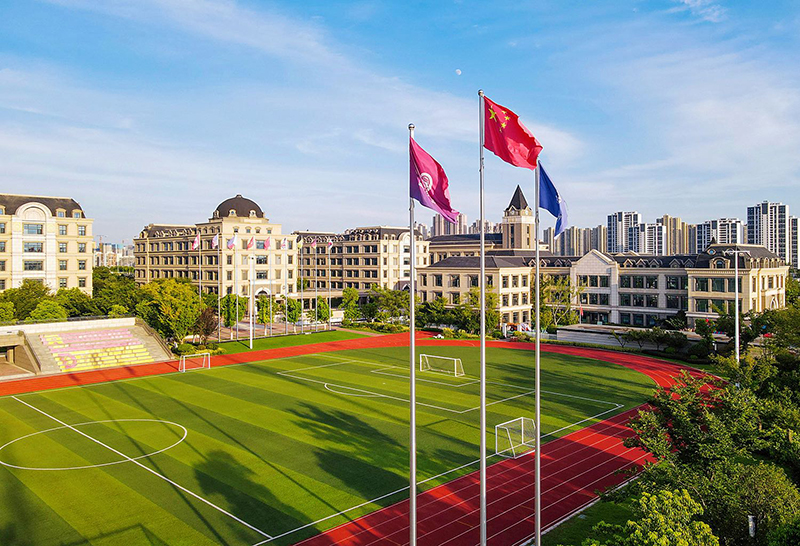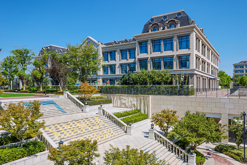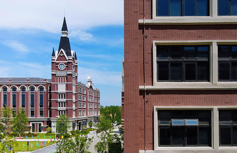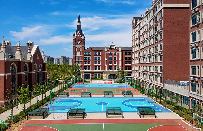 國(guó)際藍(lán)及華夏紅的配色,突顯出校園國(guó)際品質(zhì)感,褐色的墻面搭配綠茵草地,書香氣息渾然天成。