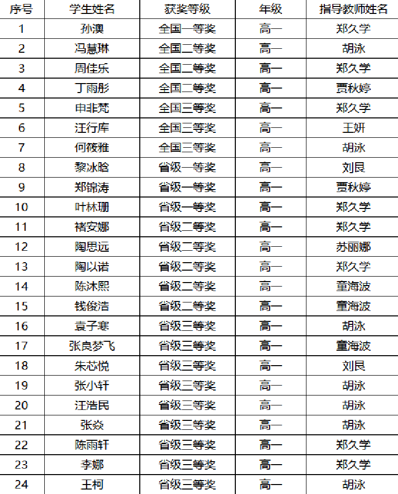 其中,高一年級孫澳同學(xué)獲得全國一等獎(jiǎng);高一年級馮慧琳、周佳樂、丁雨彤及高二年級李博軒等4位同學(xué)獲得全國二等獎(jiǎng);高一年級申非梵、汪行庫、何筱雅及高二年級劉子昂、戚思怡等5位同學(xué)獲得全國三等獎(jiǎng)。另有24位同學(xué)獲得省級一等獎(jiǎng)、二等獎(jiǎng)、三等獎(jiǎng)。