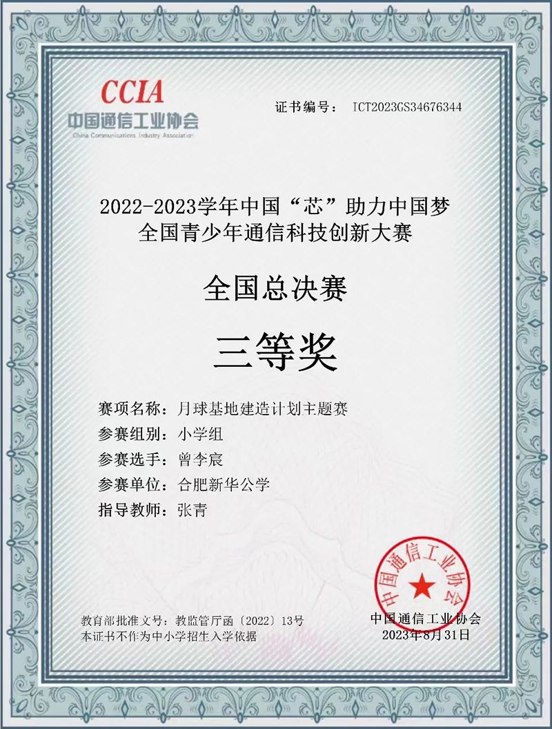 新華少年,未來可期!我校雙語部小學(xué)懷玉保誠、曾李宸、牛牧遙、李一陽四名同學(xué),在“2022-2023學(xué)年中國‘芯’助力中國夢全國青少年通信科技創(chuàng)新大賽”中獲得全國三等獎!此次大賽共2000余人參與角逐,我校學(xué)子能夠在眾多高手中脫穎而出,實屬可喜可賀。