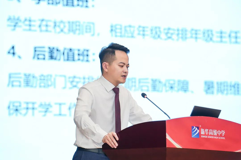 副校長吳東作暑期工作部署,重點強調(diào)了暑期放假安排、師生各項安全、班主任工作等。他希望全體教職工過一個學習型暑假,利用假期期間充電蓄能,加強專業(yè)知識學習,提升個人素養(yǎng)和教學能力;同時,在假期期間注意安全、放松身心,養(yǎng)精蓄銳開啟新學年。