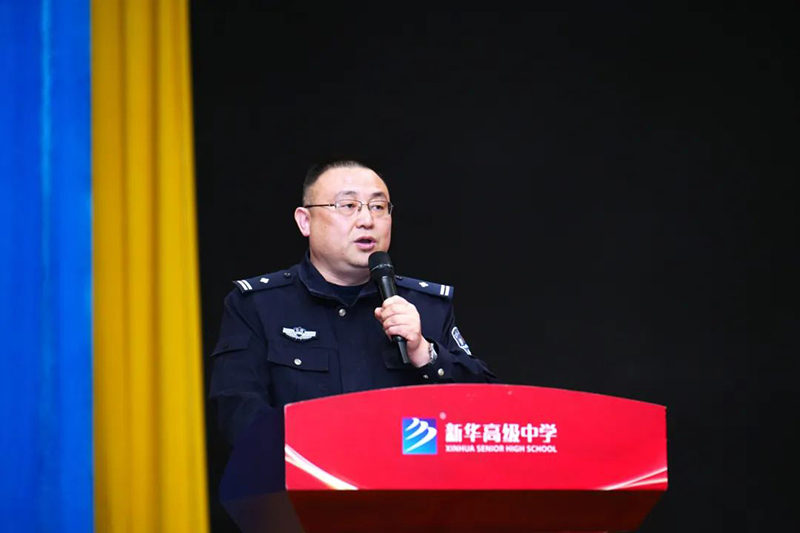 儀式伊始,新華高級中學(xué)黨支部副書記、副校長吳東向在座師生介紹新任法治副校長——雙墩派出所葉欣然警官。
