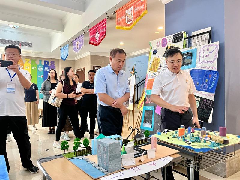 在融合部大廳,考察團(tuán)駐足觀看了學(xué)生制作的IB-MYP學(xué)科探索展,并與校領(lǐng)導(dǎo)、教師代表親切交談,陳振祿詳細(xì)詢問了跨文化學(xué)科教研情況。當(dāng)了解到學(xué)校已引進(jìn)二十余名外籍專家時,他表示:“新華公學(xué)優(yōu)良的國際化師資隊伍是培養(yǎng)全球化人才的重要保障?!?/span>