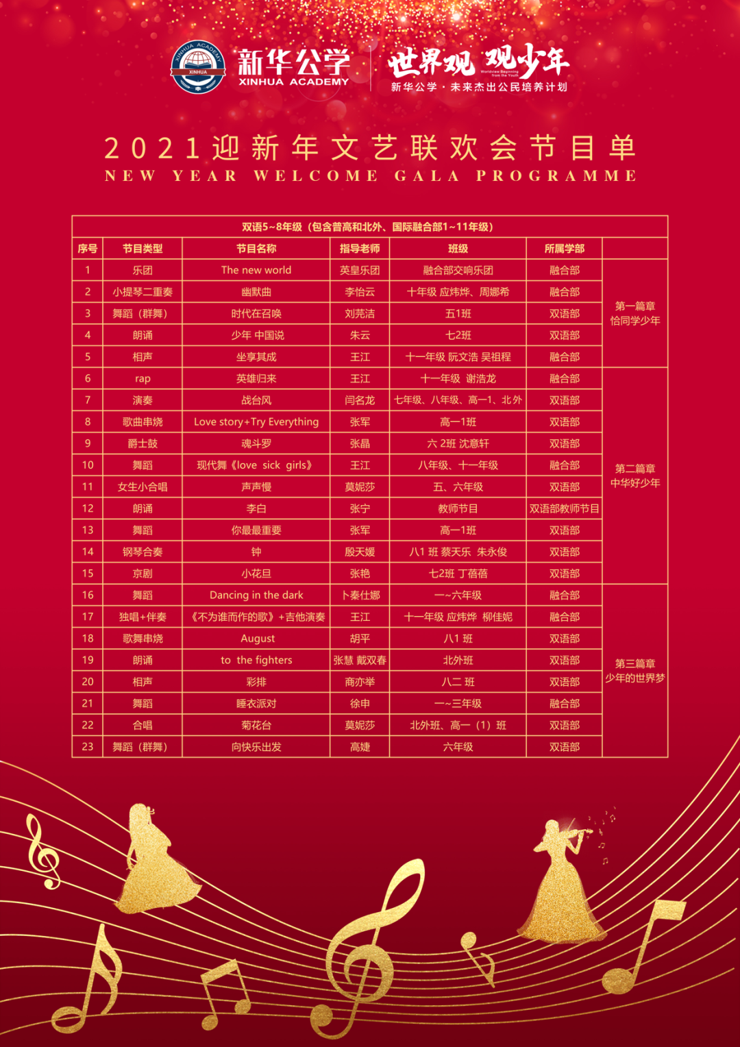 回首過去我們熱情洋溢,展望未來我們斗志昂揚,讓我們在新的一年里張開騰飛的翅膀,向著更高的目標飛翔。看了我們低年級小朋友的精彩表演,是否感覺到意猶未盡呢~~明天將會推出高年級專場匯演,敬請期待吧~~