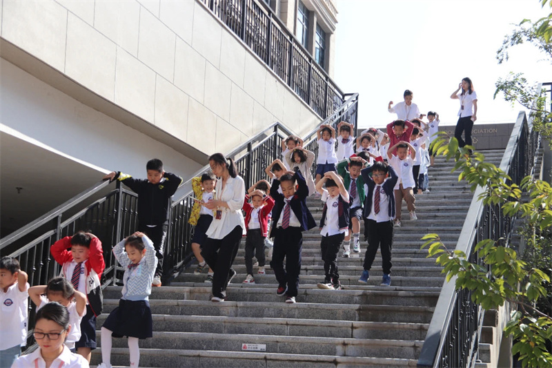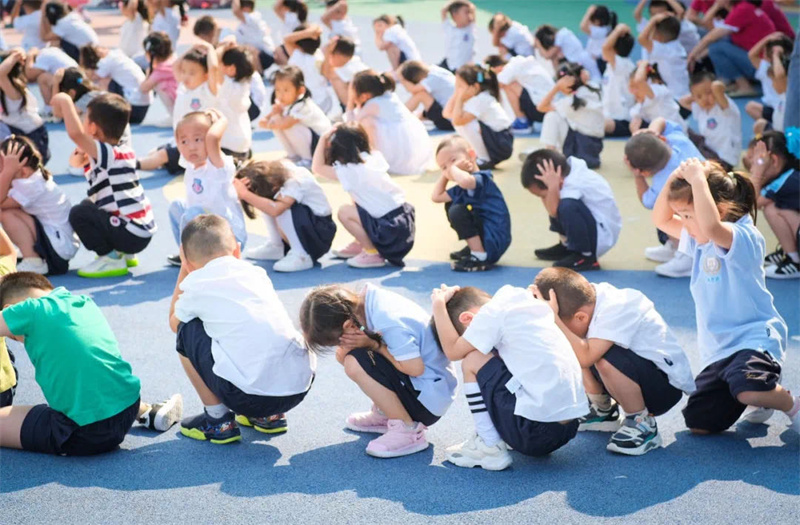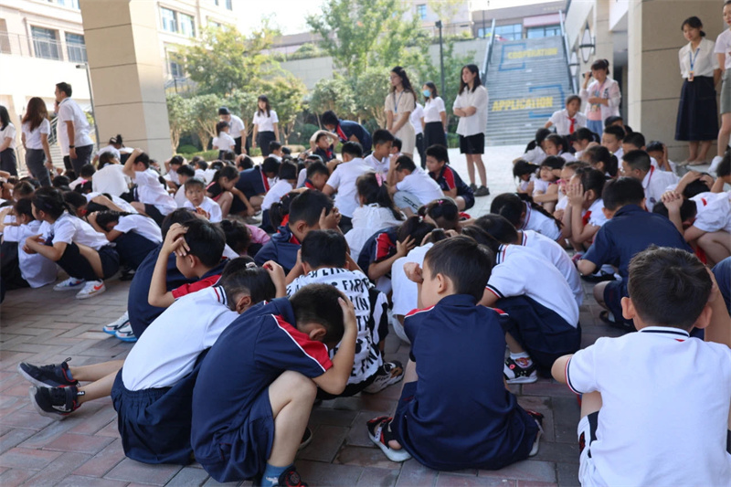 之后在凄厲的空襲警報(bào)聲中,大家立即抱頭蹲下或快速就近躲避,以防傷害。解除警報(bào)悠悠響起后,班級教師按照預(yù)定位置集中整隊(duì),清點(diǎn)學(xué)生人數(shù),匯報(bào)疏散情況,演練順利完成。