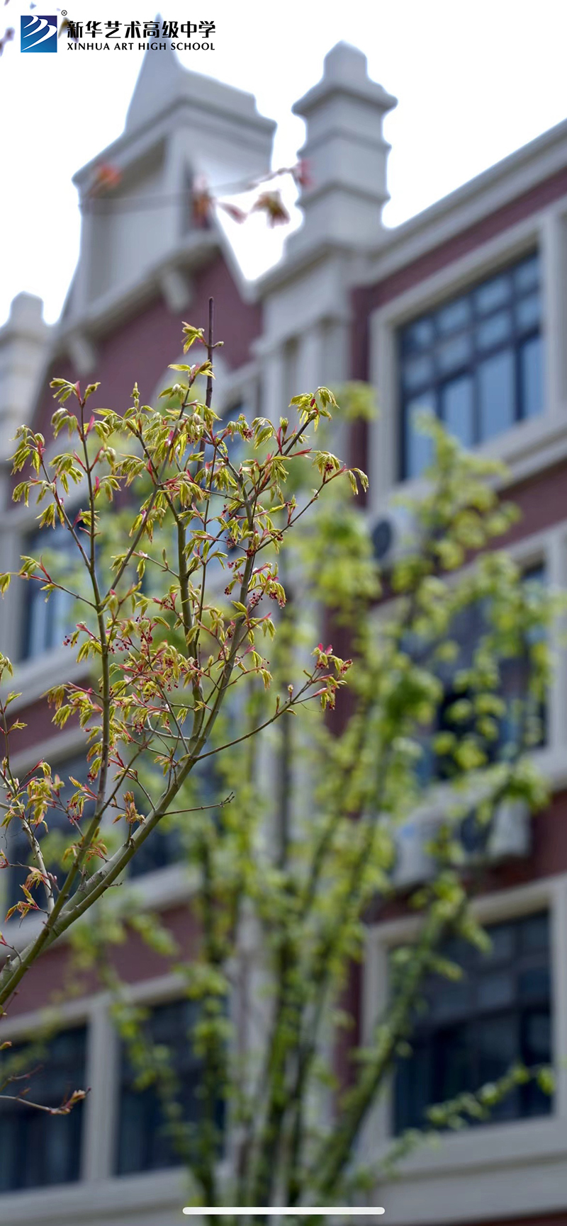 嫩綠的新芽與磚紅的教學(xué)樓映襯