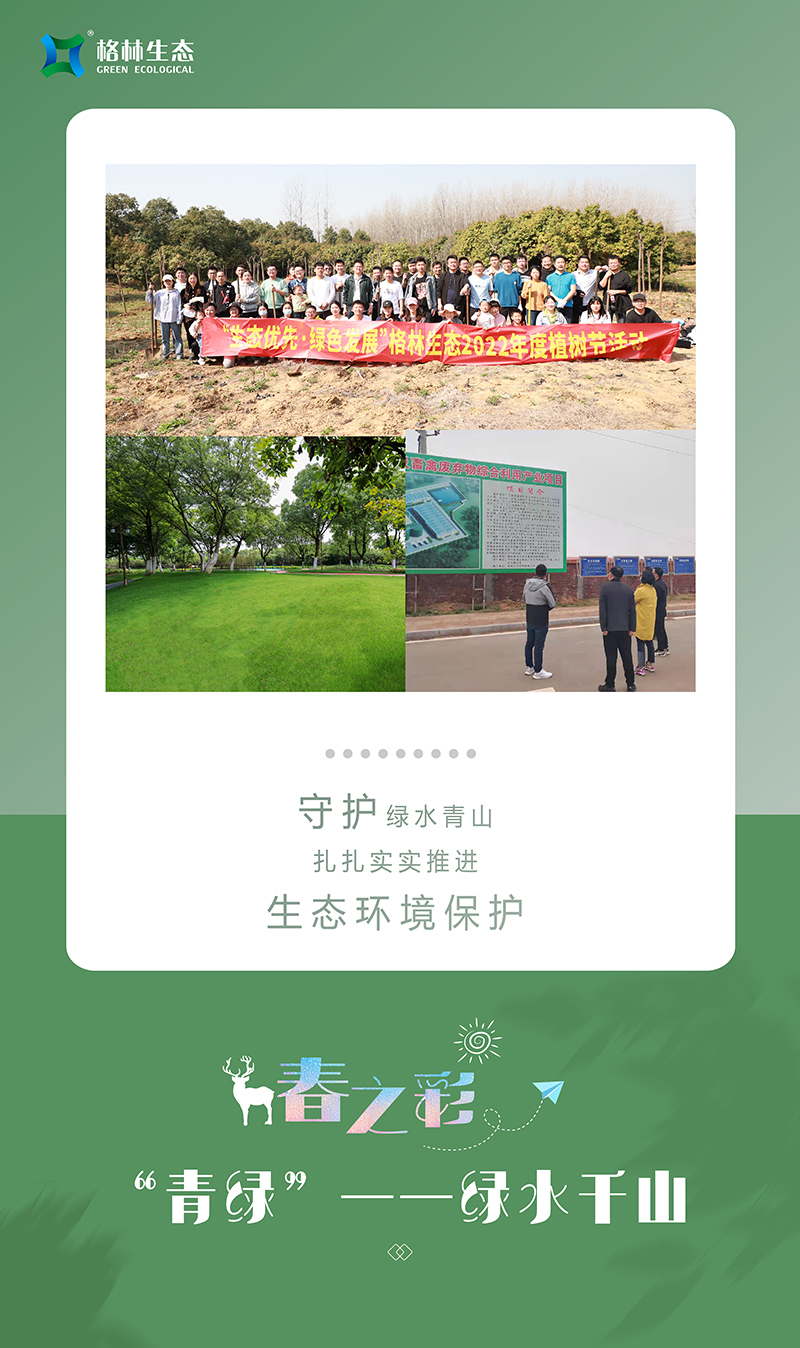 我們牢記“綠水青山就是金山銀山”的生態(tài)理念,每年開展植樹活動,今年共植三百余株欒樹和紅葉石楠球,讓綠色在大地蔓延;與此同時,格林生態(tài)積極履行社會責任,強化集約節(jié)約理念,與合作伙伴協(xié)同做好污水處理改善,促進水生態(tài)環(huán)境持續(xù)改善,努力實現(xiàn)經(jīng)濟發(fā)展和生態(tài)環(huán)保雙贏目標?,F(xiàn)如今正是楊柳青青、草長鶯飛之時,傲人的青山綠水正在以秀美優(yōu)雅的姿態(tài)展現(xiàn)出來!