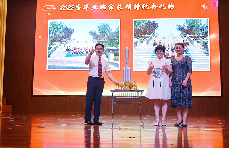 家委會(huì)代表上臺(tái)贈(zèng)送畢業(yè)禮物,有著黃金版心靈的孺子牛就像老師辛勤耕耘,托起上面的火箭(孩子),讓他們飛翔,同時(shí)“火箭”也包含了家長(zhǎng)們對(duì)新華公學(xué)的美好祝愿:越來越好,牛氣沖天。