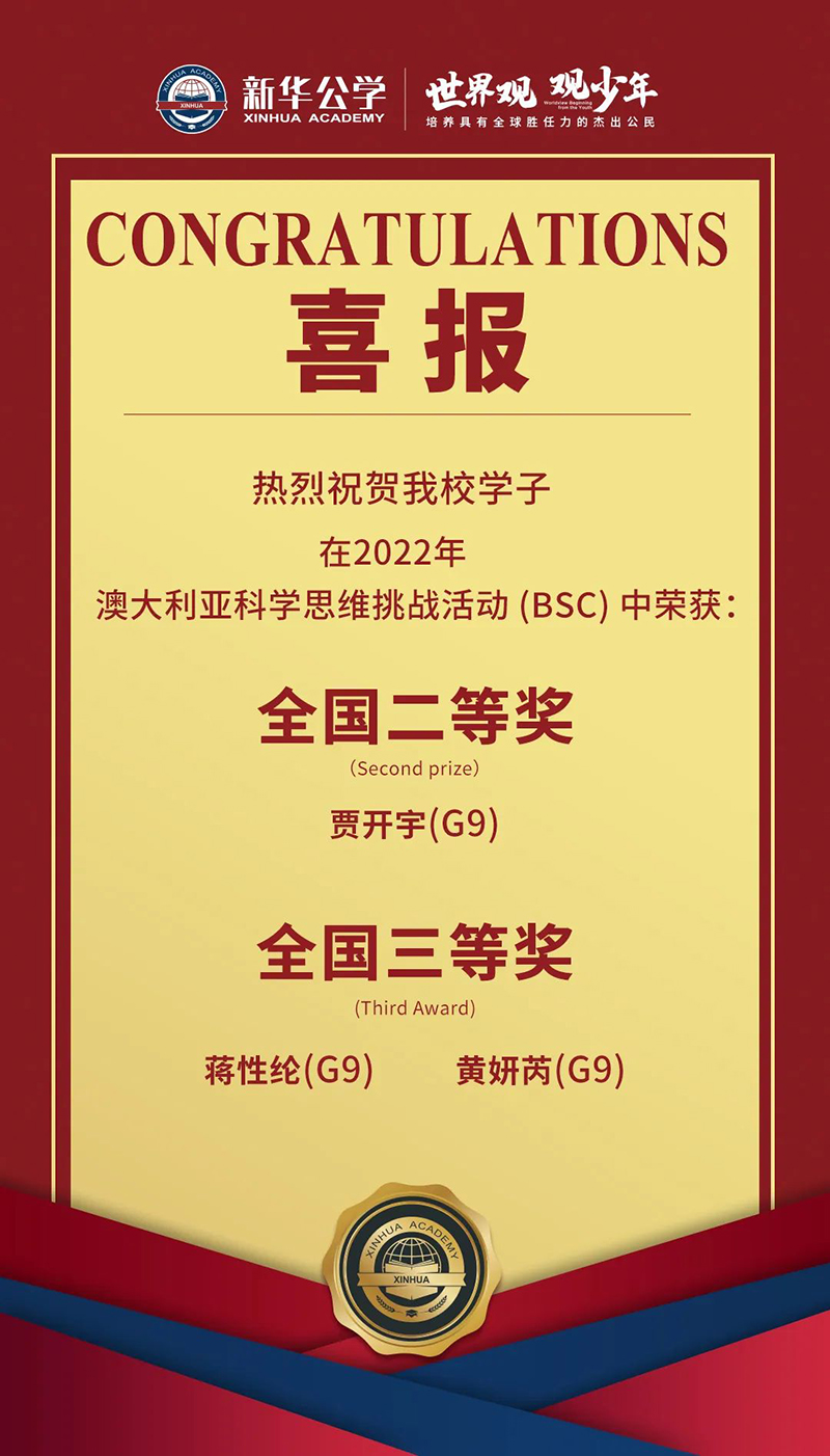 新華公學(xué)2022澳大利亞科學(xué)思維挑戰(zhàn)(BSC)成績(jī)出爐,我校融合部3人獲獎(jiǎng)。