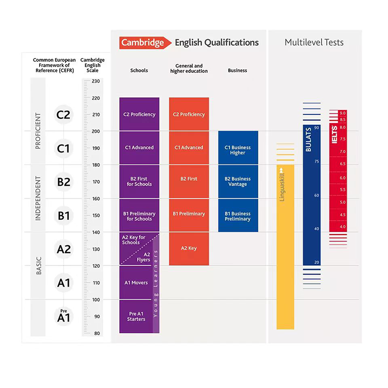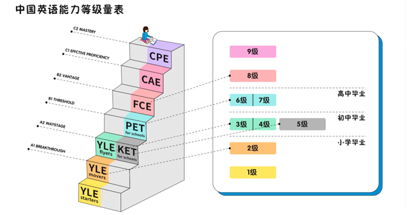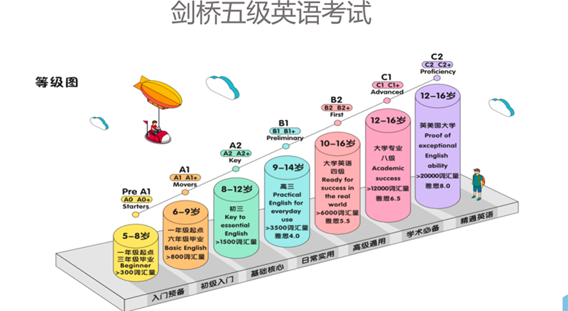下面一圖為大家介紹劍橋考試每個等級的水平對標