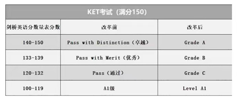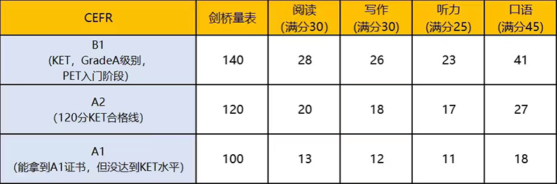 從表格我們可以看到,KET總分120分為通過,總共有三個成績段,Grade A / Grada B/ Grade C , KET總成績是取各專項(聽、說、讀、寫)成績的平均分,即 (聽力+閱讀+寫作+口語)/4≧120分以上為通過。