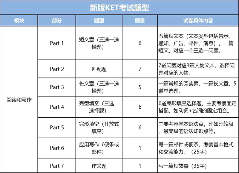 我們再來看看KET考試概況,KET主要考察四大方面,聽、說、讀、寫四大部分,每一部分的題量和分值如下: