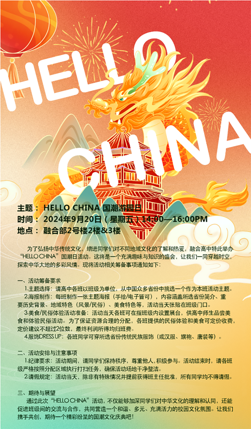 為進(jìn)一步弘揚(yáng)中華傳統(tǒng)文化,增進(jìn)學(xué)生們對(duì)不同地域文化的了解和熱愛,融合高中部于近日成功舉辦了一場(chǎng)別開生面的“HELLO CHINA”國(guó)潮游園活動(dòng)。旨在通過一系列趣味橫生、知識(shí)豐富的活動(dòng)形式,讓學(xué)生們近距離感受中華文化的博大精深。