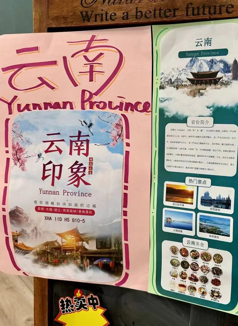 活動(dòng)現(xiàn)場(chǎng),各班級(jí)精心準(zhǔn)備的主題海報(bào)成為了一道亮麗的風(fēng)景線。這些海報(bào)不僅展示了中國(guó)各個(gè)省份的獨(dú)特魅力,還融入了豐富的歷史背景、地域特色和美食文化,讓人目不暇接。學(xué)生們紛紛表示,通過這些海報(bào),他們對(duì)中華文化的認(rèn)識(shí)更加深入,對(duì)祖國(guó)的熱愛之情也油然而生。